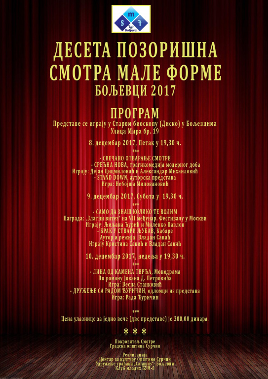 Смотра траје три дана,08., 09.и 10. децембра од 19:30 часова, а публика ће као и ранијих година моћи да види по две представе за једно вече. Цена улазница за једно вече износи 300 динара (за обе представе везано). Улазнице се продају на благајни „Старог биоскопа“ у Бољевцима пре почетка прве представе.